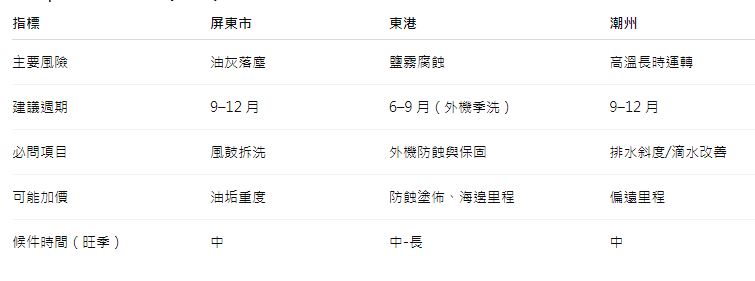 屏東高溫高濕、使用時數長,不洗=霉味、滴水、耗電高。但沿海的東港鹽害、市區的落塵油煙、潮州的熱負載又讓髒汙型態不同。